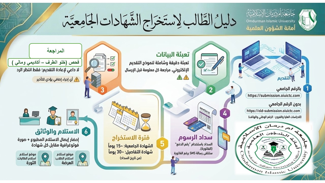 بسم الله الرحمن الرحيم والصلاة والسلام على رسولنا الكريم . يسعدنا أن نرحب بكم في الموقع الإلكتروني لأمانة الشؤون العلمية بجامعة أم درمان الإسلامية والذي صُمّم ليكون مصدراً موثوقاً ومعتمداً للمعلومات والبيانات عن الأمانة وبرامجها ، وواجهة افتراضية لعكس فعالياتها وأنشطتها الأكاديمية والثقافية والاجتماعية . وأمانة الشؤون العلمية كما عهدتموها منذ نشأتها المتزامنة مع نشأة الجامعة التي تعود إلى العام ١٣٢٢ هجري الموافق 1901م متطورة في مسيرتها من مكتب لاستخراج الشهادات إلى أن وصلت اليوم إلى أمانة متكاملة تضم الإدارات الآتية : الإدارة العامة للشؤون الأكا...