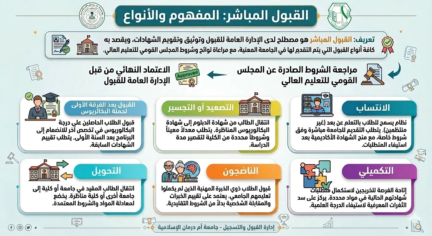 القبول المباشر مصطلح مستخدم لدى الادارة العامة للقبول وتوثيق وتقويم الشهادات يقصد به جميع انواع القبول التي يم التقديم لها مباشرة لدي الجامعة المعنية مع مراعاة لوائح وشروط القبول الصادرة من المجلس القومي للتعليم العالي ويتم اعتماده بصورته النهائية من قبل الادارة العامة للقبول ويشمل انواع القبول الاتية :-